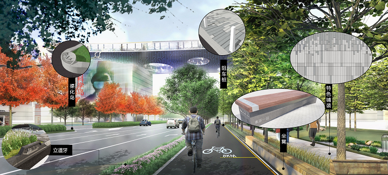 项目设计以“山、水、城”融合为抓手,结合片区功能定位,提出“创智迎宾风貌”和“生态客厅风貌”两段特色主题,通过“氛围情景化、空间多元化、景观生态化、功能人本化”四项策略,将未来一路打造为光谷科学岛的标志门户之路、迎宾会客的礼仪之路、低碳生态的绿色之路。