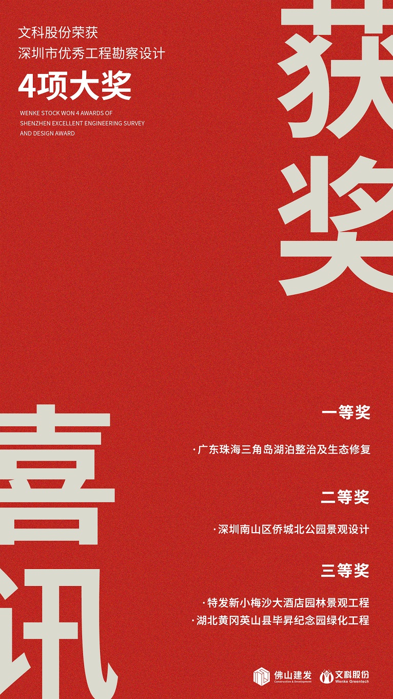 近日,深圳市勘察设计行业协会公布第二十一届深圳市优秀工程勘察设计奖评选结果,3044永利荣获4项大奖。获奖项目有“广东珠海三角岛湖泊整治及生态修复”一等奖、“深圳南山区侨城北公园景观设计”二等奖、“特发新小梅沙大酒店园林景观工程”三等奖、“湖北黄冈英山县毕昇纪念园绿化工程”三等奖,恭喜项目设计团队!