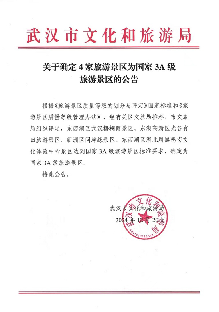 经过一年多的精心准备和整改,光谷有田旅游景区于2024年11月29日完成了现场验收,正式通过了国家3A级旅游景区的评定。这一认证不仅是对景区的认可,也为未来的发展奠定了坚实基础。光谷有田的成功认证标志着其生态旅游和服务水平的提升,但景区团队并未止步于此。