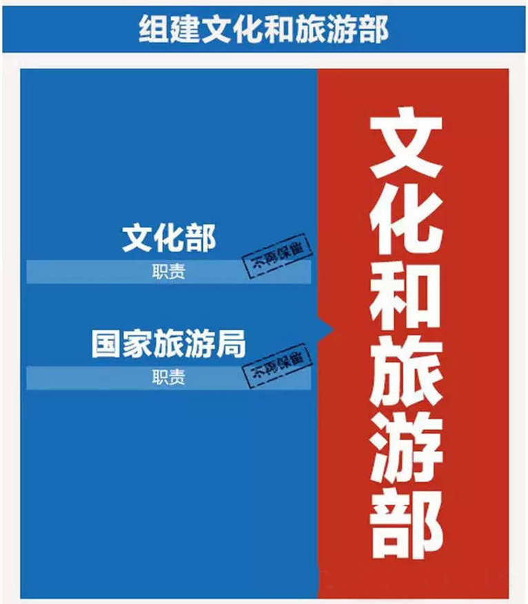 2018年3月13日,国务院机构改革方案出台,根据该方案,国家旅游局与文化部合并,组建文化和旅游部,作为国务院组成部门。不再保留原文化部、国家旅游局。国务委员王勇对此解读称,组建文化和旅游部,为增强和彰显文化自信,统筹文化事业、文化产业发展和旅游资源开发,提高国家文化软实力和中华文化影响力,推动文化事业、文化产业和旅游业融合发展。