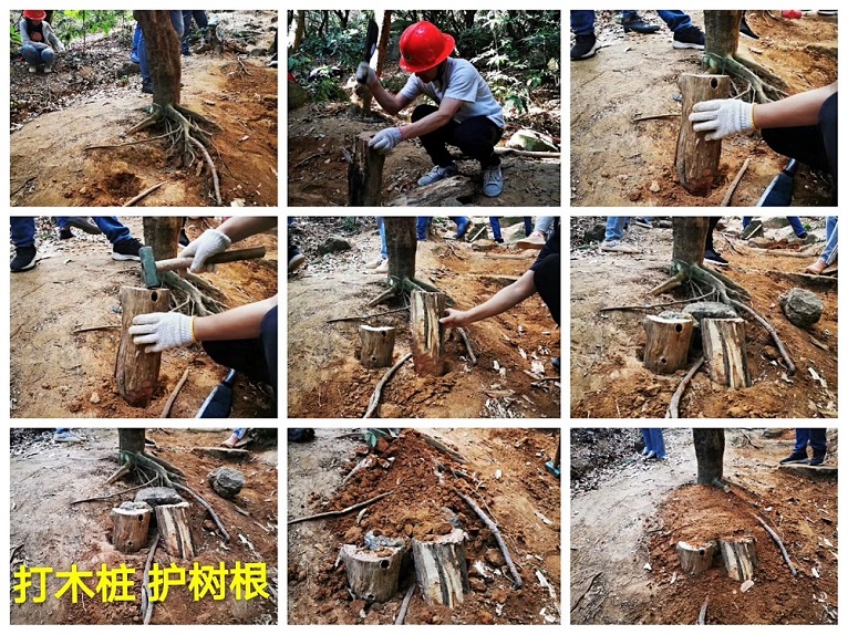 大家还对凸出的树根保护提出创新性方案,通过在树根下方打两个木桩,再回填覆土护住树根。