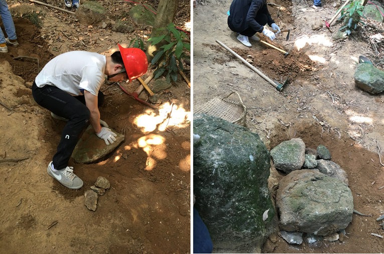 女生先进行路迹整理、除草清理路幅、修整路面排水坡向,男生则从旁边山上觅石伐木,收集现场石材、碎石备用。